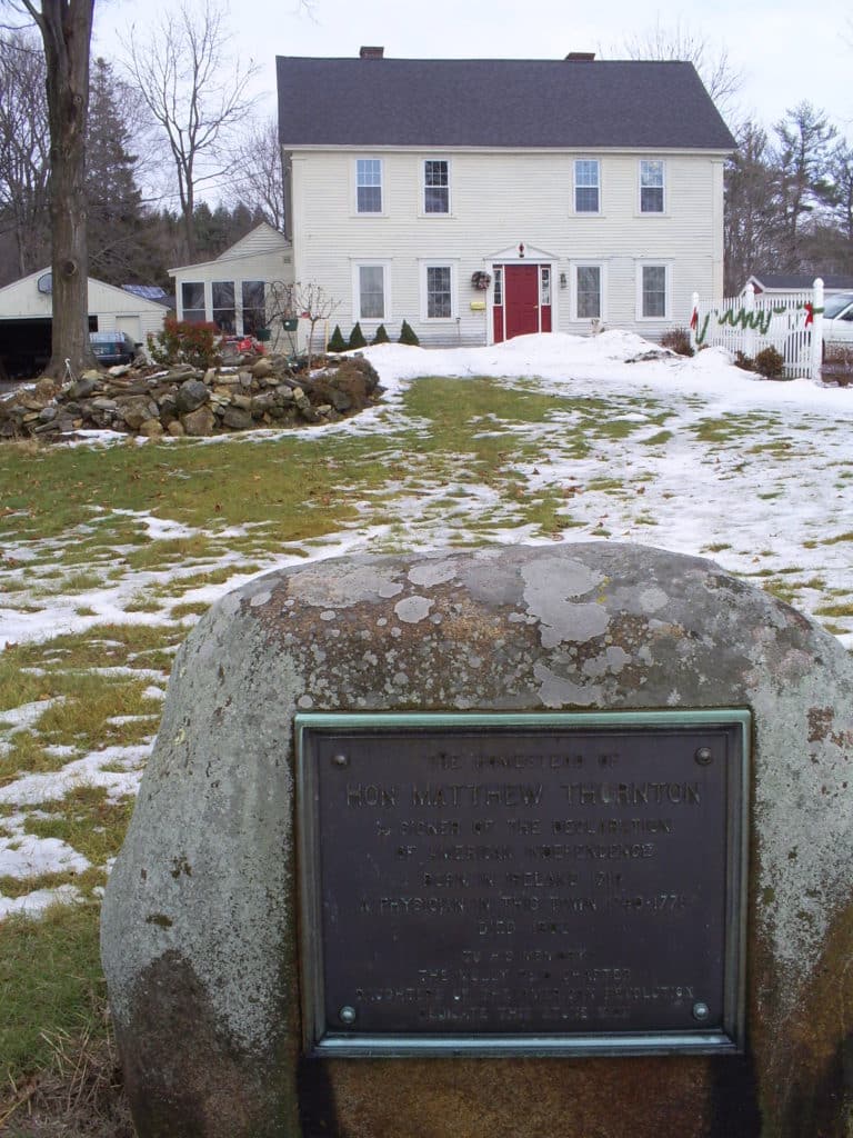 A healthy, hearty man, Matthew lived to the venerable age of eighty-nine years old, crossing over to the other side in 1803 while visiting his daughter in Newburyport, Massachusetts. Matthew was buried in the Thornton Cemetery in Merrimack, New Hampshire, where a monument erected in his honor reads, “The Honest Man.” The town of Thornton, New Hampshire is named after Matthew. There is an elementary school in Londonderry, New Hampshire that is named after him, as well as the Thorntons Ferry School in Merrimack, New Hampshire. Matthew’s house in Derry, New Hampshire, which was a part of Londonderry when he lived in it, is listed on the National Register of Historic Places.